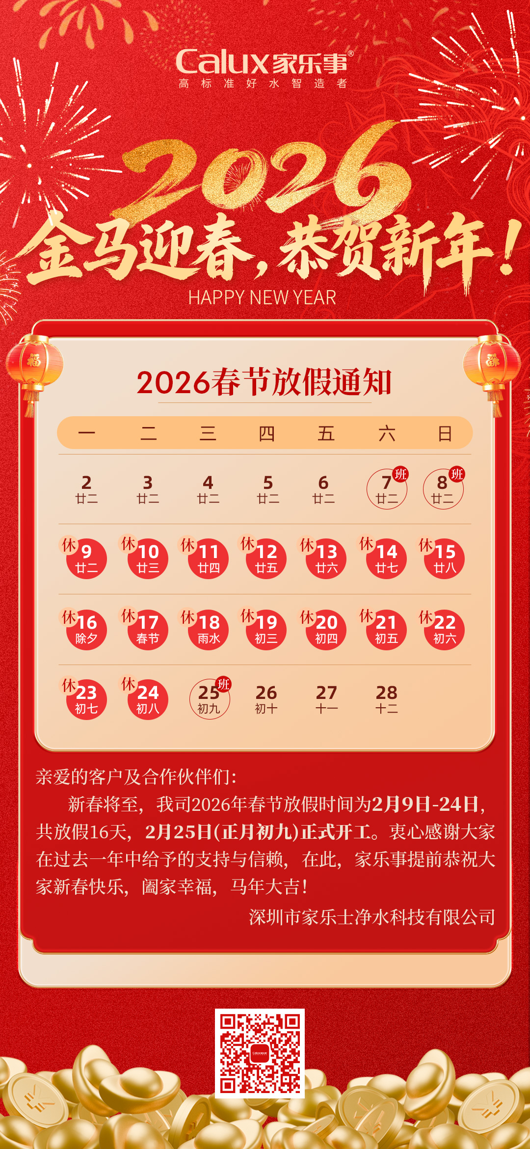 家樂事凈水器2026年春節(jié)放假通知